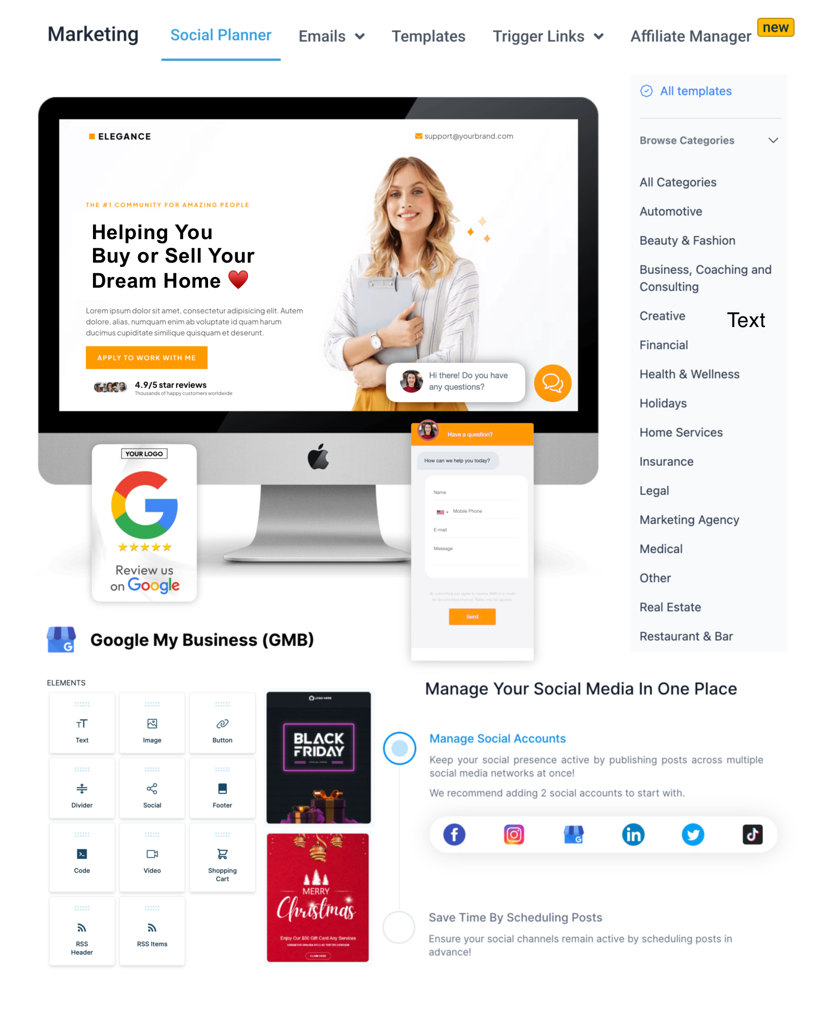 All of the tools needed to promote your business online in one place. Integrated with Google My Business (GMB).